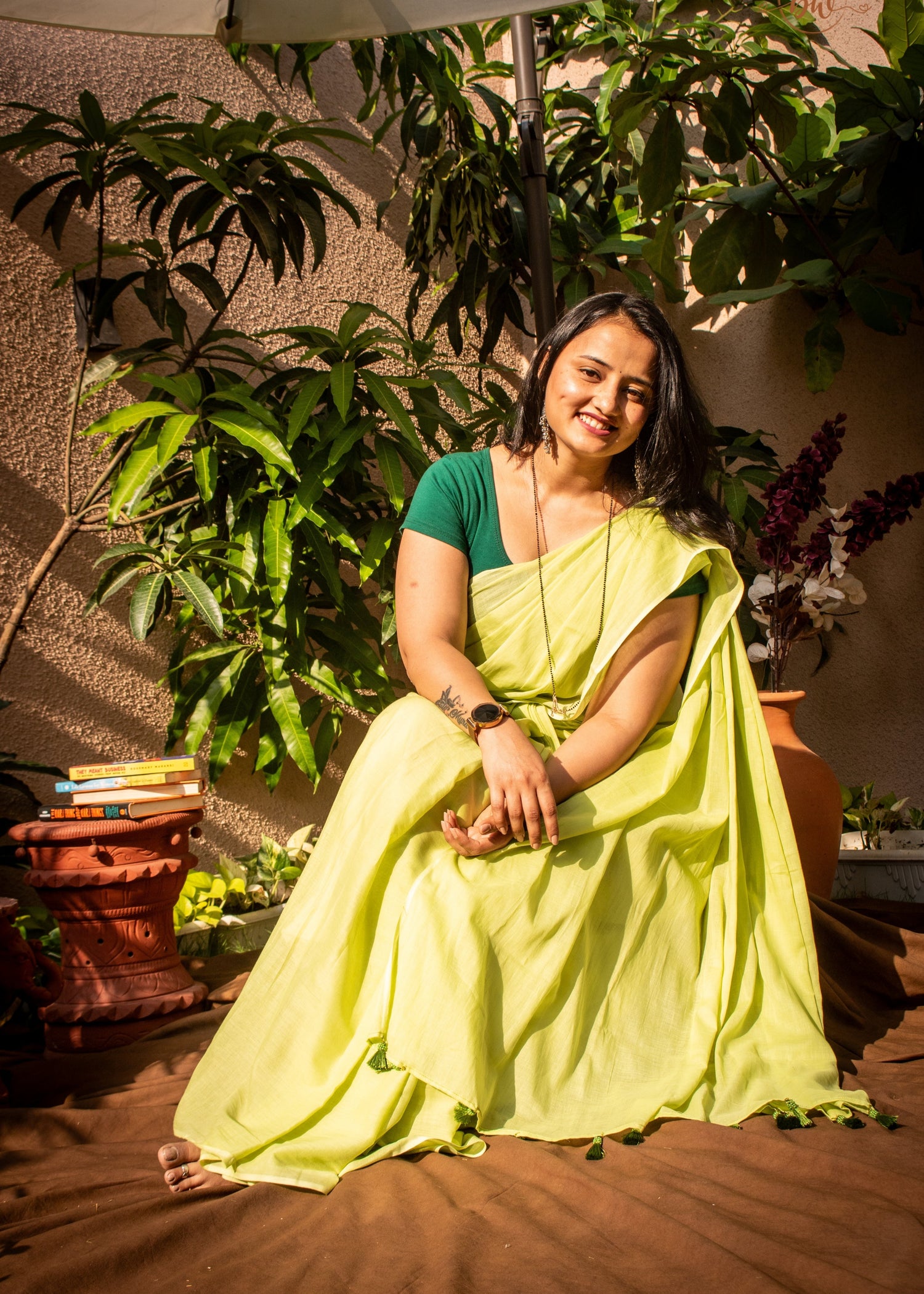 Immerse yourself in the dreamy allure of our "Lemon Zest Haze" saree. Crafted from the finest mulmul cotton, this saree drapes with an ethereal lightness, feeling like a soft haze against your skin.