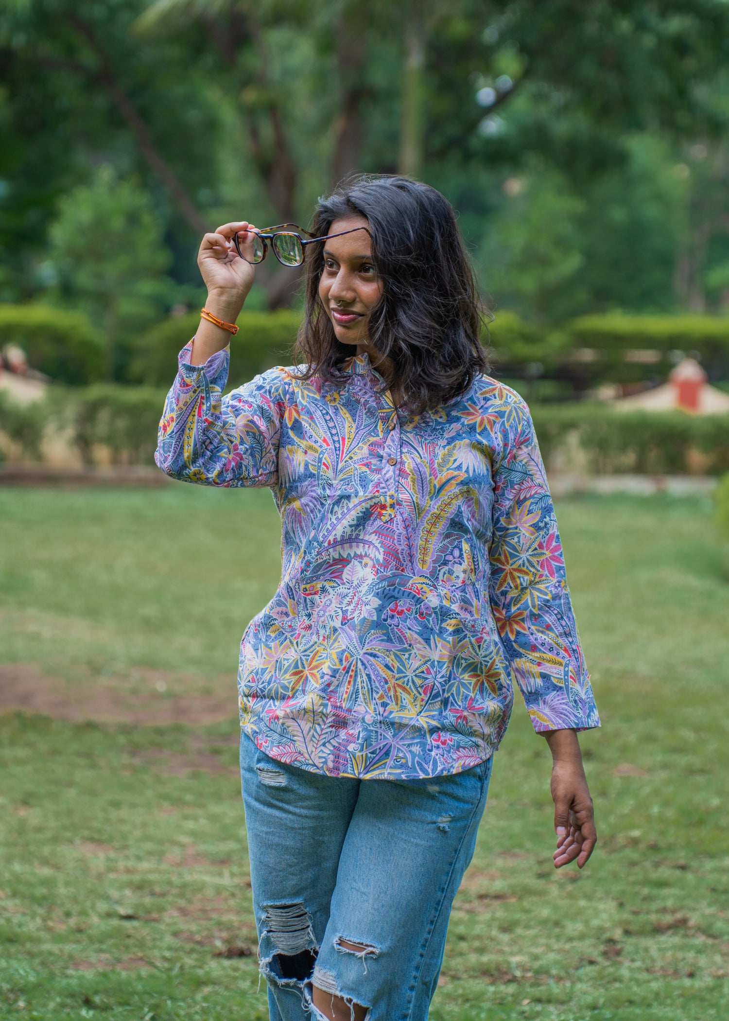 A beautiful tunic featuring a vibrant leaf print in shades of green, pink, blue, and yellow. Round flat collar for a classic touch. Perfect for any occasion.